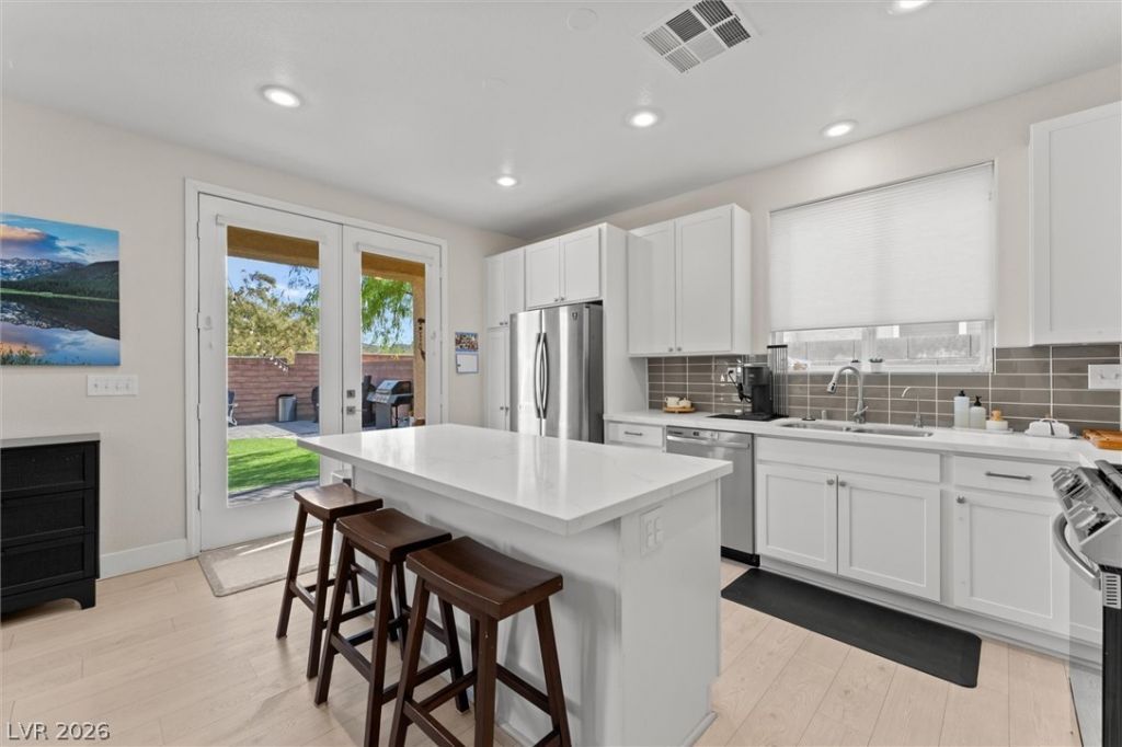 Fully paid-off solar!! Beautifully renovated 4-bedroom home in the heart of Mountain's Edge with panoramic mountain views and no rear neighbors. The kitchen stands out with quartz countertops, custom cabinetry, and a clean, modern aesthetic, while wide-plank flooring and curated finishes throughout give the home a polished, cohesive look. The primary suite is a true retreat, featuring a custom closet, spa-style walk-in shower, and a versatile flex room just off the bedroom complete with a fireplace. An oversized balcony off the suite captures the mountain views beautifully. Additional highlights include a formal dining area, upstairs laundry, and EV charging station. The backyard offers rare privacy with no homes directly behind, and features paver hardscaping, low-maintenance turf, and ambient lighting. Located near Exploration Peak Park and Mountain's Edge Regional Park, this home offers a hard-to-find combination of designer upgrades, privacy, and views.